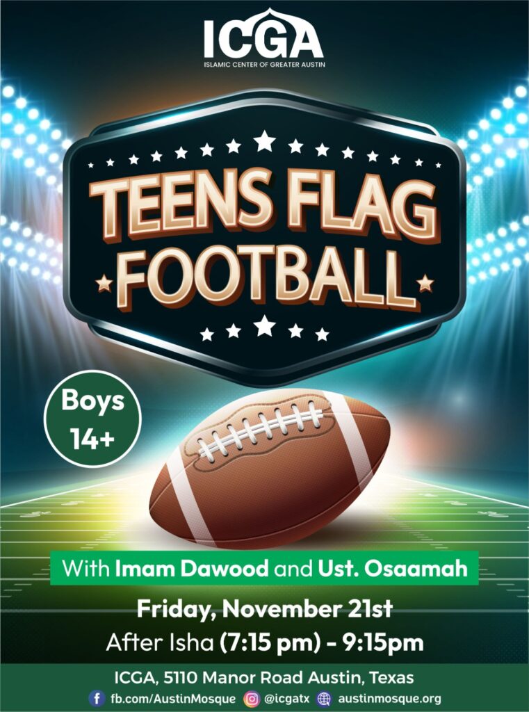 Join us this Friday for an exciting Teens Flag Football Night with Imam Dawood Yasin and Ustadh Osaamah. All teen boys ages 14 and up are invited for an evening of fun, brotherhood, and community connection. Don’t miss out on this great opportunity to play, compete, and bond in a positive environment!